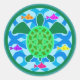 A green sea turtle with patterned shell, against a blue water/wave pattern, with several colourful fish. Circular design with a green border. Sea turtle art.