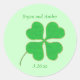 Painting of a bright green shamrock, four leaf clover, trimmed in gold dots, with placeholder for names and date, printed on stickers. Easily customise the text on the template forms.