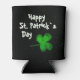 Green Shamrock Irish Happy St. Patrick`s Day Can Cooler. A Happy St. Patrick`s Day text with green Irish shamrocks for luck. The background is black. You can change the text.