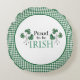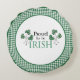 A round Pillow or Cushion, with green Shamrock leaves and 'Proud to be Irish' in Celtic scripts, on a White background with a Check Gingham border. Part of the Posh & Painterly 'Shamrocks' collection.