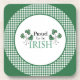 A set of six, square, cork-backed Coasters, with green Shamrock leaves and 'Proud to be Irish' in Celtic scripts, on a White background with a Check Gingham border. Part of the Posh & Painterly 'Shamrocks' collection.
