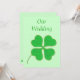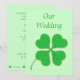 Painting of a green shamrock, four leaf clover, trimmed in gold dots, printed on wedding invitations. Easily customise the text on the template forms.