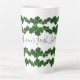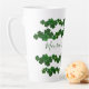 Green shamrocks tall latté mug with personalisation. Rows of green clover around the mug, with space in the centre for short saying. Sample text reads, "Maureen's Irish Latté". Personalise with a name using modern, hand-written font in dark green.