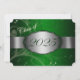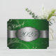 Green and silver graduation invitation with light and dark green floral and a silver ribbon going across showing the year of graduation. The back of the card is green with light silver font for people to fill in the graduation party invitations.