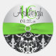 This 1.5" round lime green, silver grey, and black damask Sweet 16 sticker or envelope seal has a PRINTED ribbon and a PRINTED diamond jewels buckle on it that matches the Sweet Sixteen party invitation shown below. Customise with your own text. Other shapes and sizes are also available. ***USE caution if you choose a different shape, as some text may get cut-off during printing. Everything will print as it appears on your monitor, and there is a large safety zone around the edge of the stickers, so it would probably be best if you contact me at the email address below if you prefer an alternate shape or need to add additional text. If you need any assistance, please email niteowlstudio@gmail.com for help.