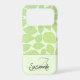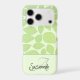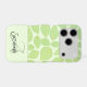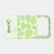 The design features a green skeleton leaf pattern background over pastel green with the custom name and initial letter monogram at the bottom. Personalise the text, remove one or all the text or edit using the design tool to select a font style, size, and colour you prefer. You can also transfer this design where it fits appropriately to another phone case brand, the luggage tag or other product in the scroll bar.