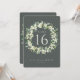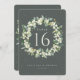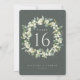 A dark grey green, double-sided wedding table number card featuring hand painted snowberries and eucalyptus arranged into a beautiful botanical wreath. All text is fully editable. Other designs, table number products and coordinating items are available in my store.