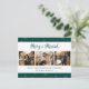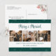 Green photo newlywed holiday postcard featuring snowflakes and a watercolor painting of poinsettia, connifer tree branches, holly and red berries. Easily personalize this festive newlywed holiday postcard with your photos, and text.