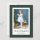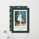 Custom green snowflake photo Christmas cards with calligraphy title and featuring a green snowy photo frame on the front and snowflakes at the back. Easily personalise these snowy photo Christmas cards with your image and family name.
