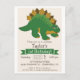 Green stegosaurus dino, prehistoric dinosaur theme neutral, boy or girl birthday party invitation. Personalise this cute, retro feel invite with your child's name. Cute, simple, plain design. Perfect for baby's first, 1st, birthday, toddler, young children, or older kids. Colours include green and brown.