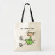 A stick figure girl ice skater wearing a green dress on a tote bag you can easily customise with a name or other text before ordering.