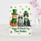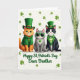 This greeting card shows three dressed-up cats lined up across the front, looking straight at you with bright, friendly eyes that feel like an inside joke between close pals 💚. On the left, an orange tabby wears an emerald top hat with a gold buckle and a textured green sweater fastened with a gold toggle, its relaxed posture leaning slightly toward the others. In the middle, a sleek grey cat sports green sunglasses and a small green heart pendant, adding a flirty touch as it angles its face toward its companions. On the right, a tuxedo cat wears a tall green top hat, a green bow tie, and a green-striped shirt under green lapels, standing crisp and proud beside the group ☘️. Behind them, a creamy white background is sprinkled with small four-leaf clovers that drift around like confetti. Along the bottom, the line “Happy St. Patrick’s Day Dear Brother” is set in green lettering, centered beneath the trio. The greens repeat across hats, ties, and accessories, while the clovers dot the pale backdrop in a light scatter pattern.