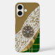 A pretty green tartan and white lace design with a diamond jewel centre piece easily change the white background colour.