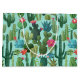 This is a pattern of decorative green and teal flowering cacti on a light turquoise background.