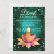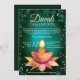 Illuminate your Diwali with the radiant glow of our exquisite celebration! Our invitation features a hand-drawn illustration of a stunning ornate Diwali lamp, bathed in in green and teal hues with golden, yellow, and orange accents. The candlelight dances against a green ombre background, adorned with glimmer and bokeh, creating an enchanting atmosphere. The elegant script font typography adds a touch of sophistication to this invitation, promising an evening of joy, light, and shared blessings.