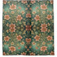 This is a shower curtain that has a green tone background with orange type of flowers. It's in the art nouveau style.