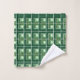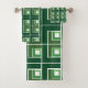 This towel set has a geometric design made from Ls in shades of green laid in different directions repeating across the design.