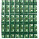 This shower curtain has a geometric design made from Ls in shades of green laid in different directions repeating across the design.