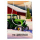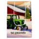 A farmer's favourite green tractor is parked in front of a red barn in the snow.