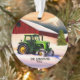 A farmer's favourite green tractor is parked in front of a red barn in the snow.
