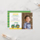 A green farm tractor horizontal layout invitation for the birthday boy who love tractor trucks and vehicles! Colour palette of green, yellow and grey! On the reverse is a simple tractor track pattern. Personalise easily with your party details. On the right side is a photo area for personalisation of the birthday boy.