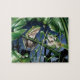 This puzzle's design features an image of a pair of green tree frogs over water. The painting is by artist Dawn Witherington.