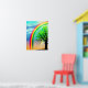 Poster in in a green, watercolor tree, against a blue sky and a vividly coloured rainbow