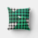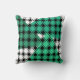 This throw pillow has a mid-century modern design of solid black diamonds inside black diamond outlines with triangles in shades of seafoam green under them, all on a field of white.