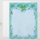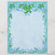 Green sea turtle in cutout style against chequered blue background. Unlined stationery. Blank letterhead paper with stylised flame border.