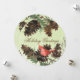 A beautiful Christmas holiday card to send to all your friends and family members, features a round card with a pale green watercolor background, pine cones, tree branches, a red cardinal, and customisable text that reads Holiday Greetings on the front, the same green watercolor background, pine cones, red cardinal, and branches with a customisable area to add your family name, first names, and current year on back.