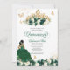 Quinceanera invitation in deep emerald or evergreen green featuring gold butterflies and a beautiful tiara and a girl in a flowing ball gown. Visit shop for more variations in skin tone and colour combinations