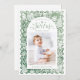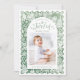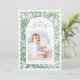 Whimsical joyful holiday card features hand drawn festive Christmas celebration illustrations in watercolor sage green color, with personalized family photo, modern and fun.