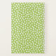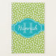 Stylish, trendy light green and white dot pattern in the background, topped with a bright teal blue label featuring a customisable name and monogram template.