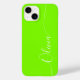 Green White Elegant Calligraphy Script Custom Personalised Name iPhone 14 Smart Phone Cases features a modern and trendy simple and stylish design with your personalised name in elegant hand written calligraphy script typography on a green background. Designed by ©Evco Studio www.zazzle.com/store/evcostudio