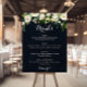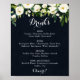 This green white floral blue wedding drinks menu sign is perfect for a rustic wedding. The design features elegant watercolor white peonies with green foliage in a dark blue background.