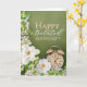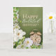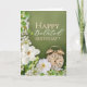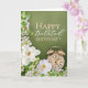 This belated birthday card features a soft green background paired with elegant white florals and leafy greenery, creating a fresh and uplifting botanical look. A vintage gold alarm clock sits near the bottom, adding a meaningful time-themed detail that complements late birthday wishes beautifully.