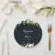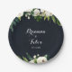 This green white floral royal blue wedding cake paper plate is perfect for a rustic wedding reception. The design features elegant watercolor white peonies with green foliage in a dark blue background. Make it your own by adding the names of the bride and groom and wedding date.