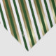 Holiday tissue paper with a diagonal stripe design of gold, white, and dark green.