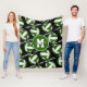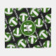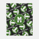 This volleyball themed fleece blanket features a mirrored pattern of volleyballs with green and white panels and the sporty font text "I love volleyball" in white that stretches between the angled rows of volleyballs - athlete name and monogram can be personalised on the large overlying circle pendant - background is customisable black - easily delete the "I love volleyball" text lines, if desired, or replace the monogram with the player's varsity letter or jersey number - by katz_d_zynes