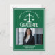 This custom green law school graduation announcement postcard features white typography for a class of 2024 graduate above your student photo. Customise with your graduating year under the scales of justice and photograph for a great personalised lawyer or attorney postcard.