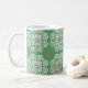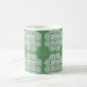 Coffee mug in Scroll Medallion design. Medium green background, with a white repeating scroll medallion print. Grey & black detail accents. White base, handle and interior.