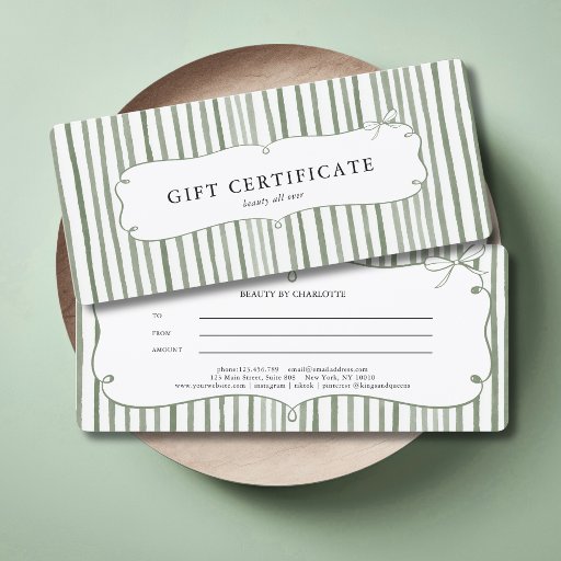 Add a feminine, on-trend touch to your branding with this elegant sage green and white striped gift certificate featuring a delicate coquette bow and ornamental frame design. The soft stripe pattern combined with the vintage-inspired ribbon bow detail creates a refined boutique aesthetic that feels romantic, stylish, and timeless.
