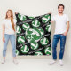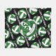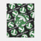 This sporty volleyball team spirit fleece blanket for girls features a large green and white artsy, stylised volleyball, upon which her name and jersey number can be personalised, overlying a pattern of smaller green and white volleyballs and the sporty font text "I love volleyball" that stretches between the angled rows of volleyballs - background is customisable black - by katz_d_zynes