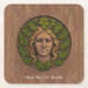 A Green Woman carved in wood with paint applied to the oak leaves and hair. Customise by adding your own text.