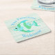 Beach cottage theme pulp board paper coasters, with graphics of a whimsical blue, green and white patterned fish, on a light green wood washed looking background. Personalise the blue arched text to suit your needs. Great for anytime use and makes a nice gift idea.