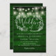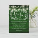 A rustic wedding invitation featuring pretty string lights and a delicate hand-drawn rustic floral garland of botanical leaf foliage with stylish script typography, on a rustic emerald green wood background. Personalise with your special wedding day information. Designed by Thisisnotme©
