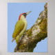 Poster with photo of green woodpecker on apple tree trunk. Light blue background.