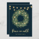 These trendy and stylish cards feature a pretty, watercolor green wreath with gold coloured star accents and elegant string lights, with modern script calligraphy that says "Peace on earth" on a dark, midnight blue background.