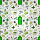 Hand illustrated pattern of gin bottles, cocktails, stirrers, lemon and lime slices and juniper berries