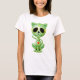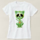 This adorable green kitten design is decorated with swirls and dot patterns. Yellow flower pedals circle the pure black eyes in the tradition of the Day of the Dead sugar skulls. The cat is sitting down, looking forward with its tail waving in the background. The oversized head sits on a tiny body which creates a playful, cartoon like appearance. A five point star sits in the middle of the kitten’s forehead while a bright red and yellow heart appears in the centre of the chest. This cute little cat is a fun and stylish design inspired by the beautiful patterns of Day of the Dead sugar skulls.